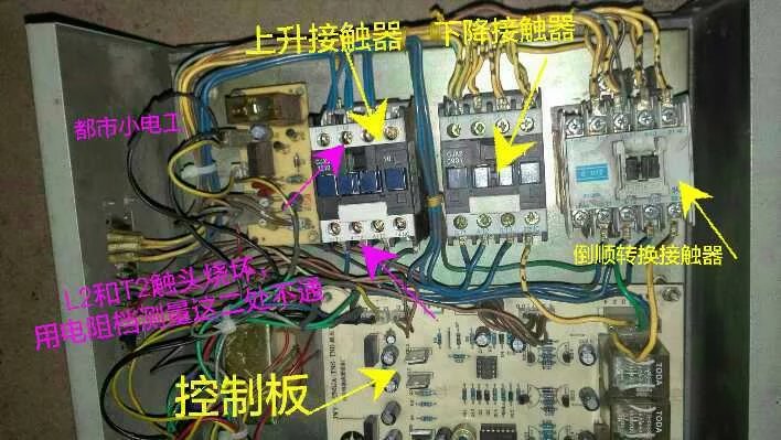 停電檢修拆下控制箱,包好控制箱的插頭防止事故,轉為手搖控制電壓,繼續使用。拆箱檢查發現一個接觸器的觸頭燒壞,難怪觸頭壞了一個,三相只通過二相電,三相控制電機肯定不轉,就不能升壓(這個接觸器是升壓的),這就是問題所在,停電裝好檢查試機正常升降電壓,搞定OK。